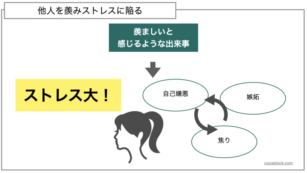 そして、自己嫌悪・嫉妬・焦りを感じている状態の自分に気づき、「こんなこと考えるなんて、わたしって最低…」とストレスを感じていました。